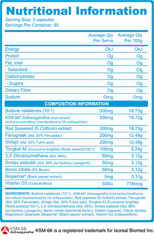 Infused with advanced and clinically dosed KSM-66 - “World’s Premium Ashwagandha”. KSM-66 has been clinically proven to help maintain normal cortisol levels, enhance performance, recovery & male vitality.