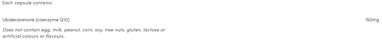 • C oQ10 150mg contains CoQ10, an antioxidant that reduces free radicals formed in the body.
