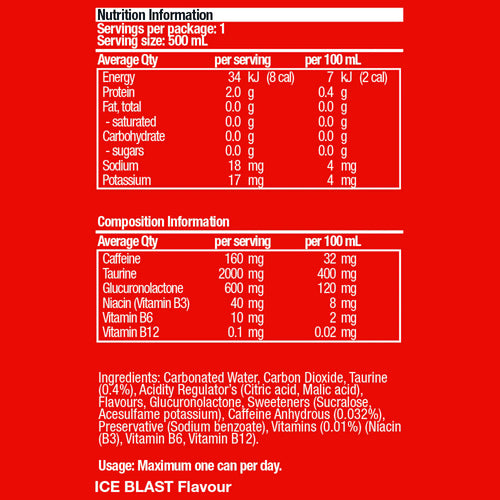 The ultimate energy drink that will give you the boost you need to conquer any challenge that comes your way. Get ready to experience a surge of energy with a maximum level of 160mg of caffeine, zero sugar, zero carb, while adding B Vitamins, Taurine and Glucuronolactone.
