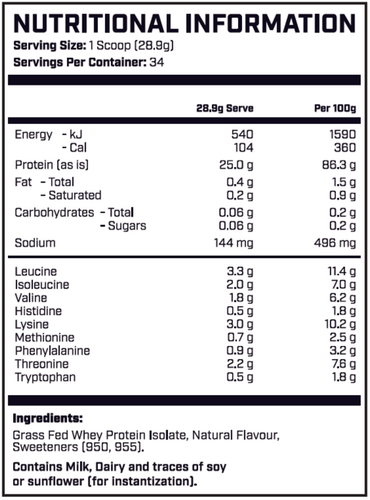 Whether you're working out in the gym, on the football field, or in the pool, it is essential to provide your body with high quality protein to maximise your results. Grass Fed Whey Protein isolate is uniquely high in Essential Amino Acids (EAA's) which provide all the essential building blocks to build muscle tissue. Clinically backed through dozens of studies, WPI has rightly been crowned the king of protein supplements. Don't shortchange yourself by compromising on quality - use the best and achieve your best with Cyborg Sport Grass Fed WPI.