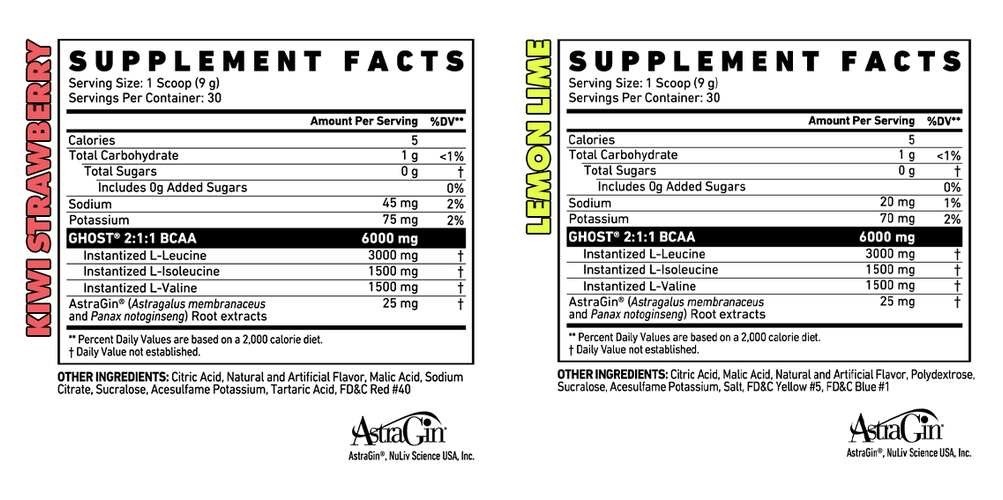 GHOST BCAA delivers a massive 6G 2:1:1 BCAAs (3000MG Leucine, 1500MG Isoleucine and 1500MG Valine) per scoop. Along with Astragin that works to help improve your body's ability to absorb key amino acids, proteins and glucose. In other words, Astragin ensures you're getting maximum benefit from every scoop of GHOST BCAA.